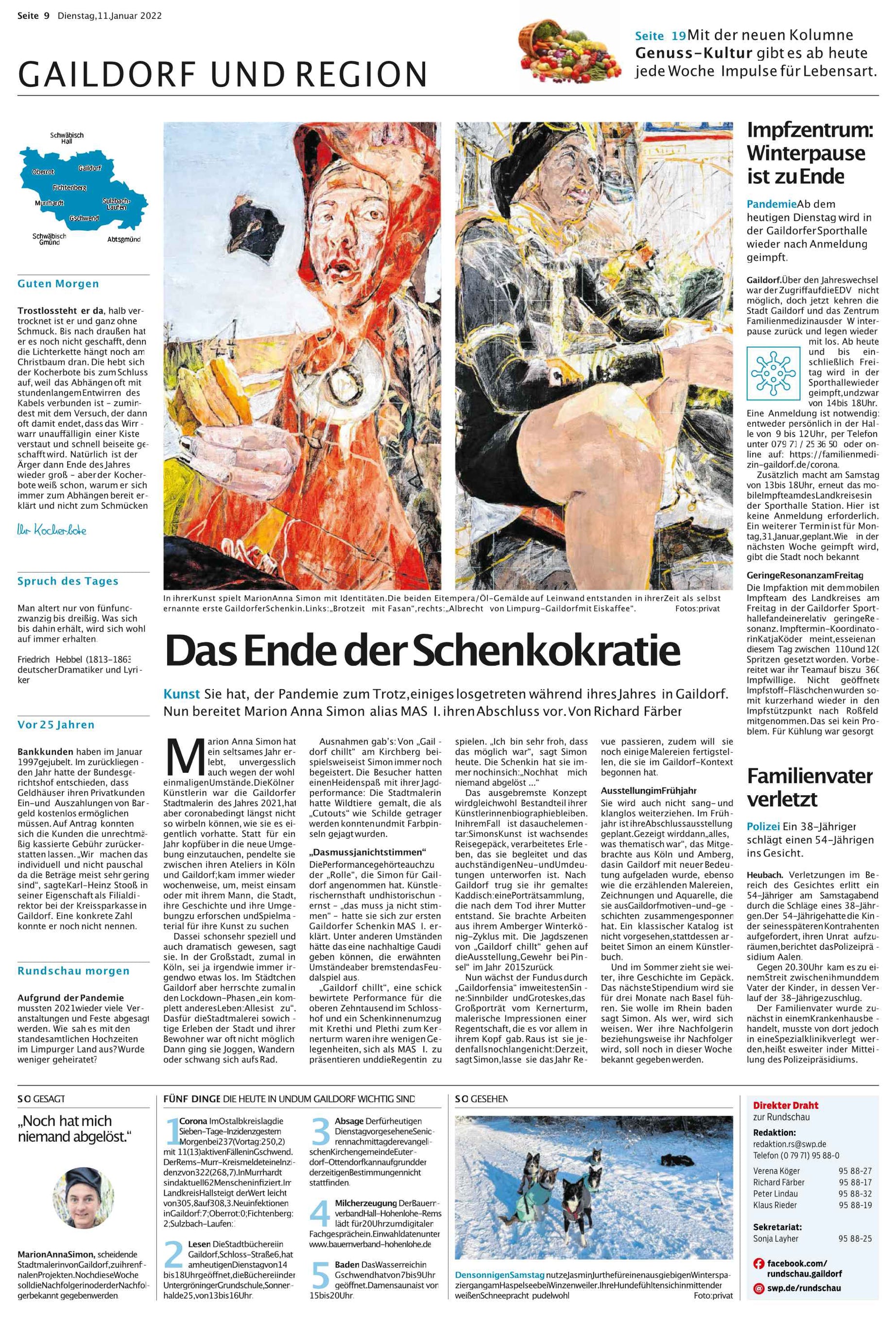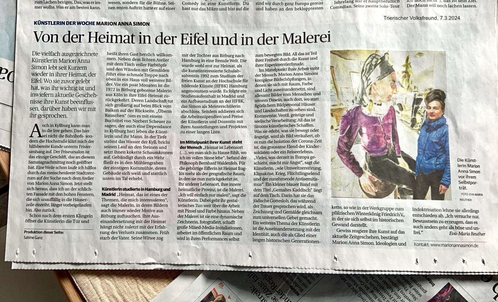 Haus, Auto und Personal (seit 2025) HAUS DER KUNST KYLLBURG (seit 2024) MAS I (2021) `ZOONpoliticon´,`Judith und Salome´ und `der Talisman´(seit 2019) Gemaltes Kaddisch (seit 2017) Der Winterkönig im Schlamm der Kunst (2017) Die heilige Ursula (2012-2013) Salon Arendt (2013) Die Acephalen (ohne Haupt/die Kopflosen) (2013-2016) Wer Friedrich hat, hat die Kunst (2010)  Pina Bausch (2009-2011) 6 x Selbst (1999-2012) Das Herz springt in der Brust (2002-2004) Das Deutsche Haus (2001-2005) Für meinen Vater (1998 - 2001) Portrait Zeichnung Performance Glas Fayence Biografie Literatur Presse Kontakt Kunst am Bau Impressum
